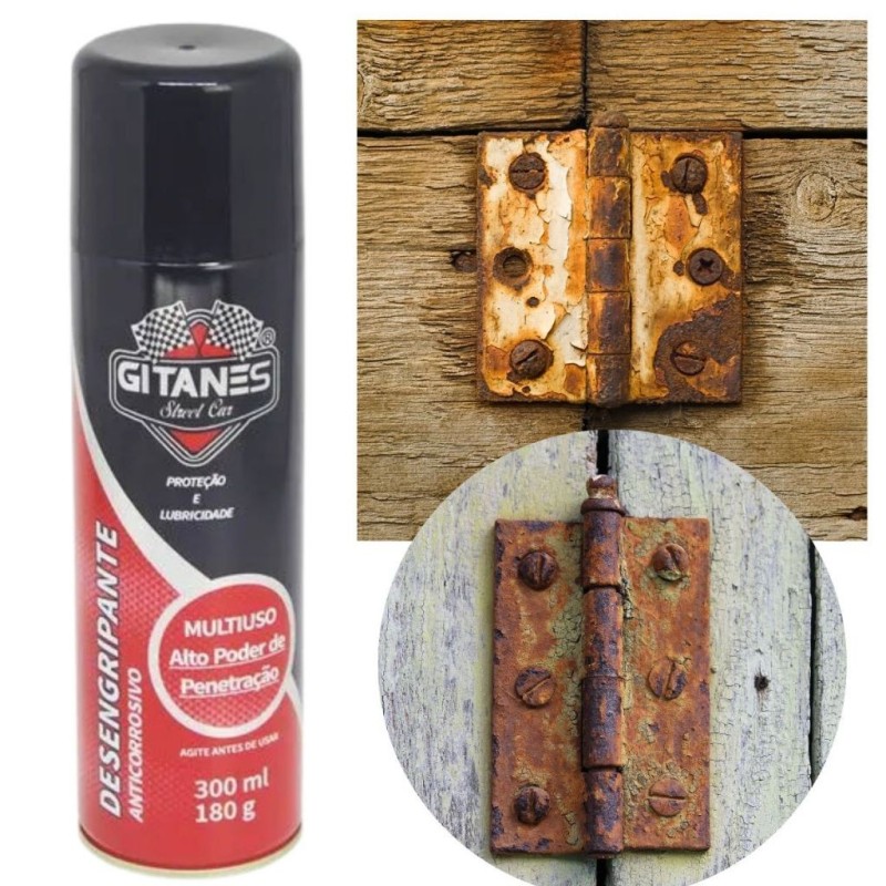 Desengripante Anticorrosivo Gitanes 300mL: lubrifica, destrava parafusos, elimina rangidos e protege contra corrosão. Uso automotivo, doméstico e industrial.