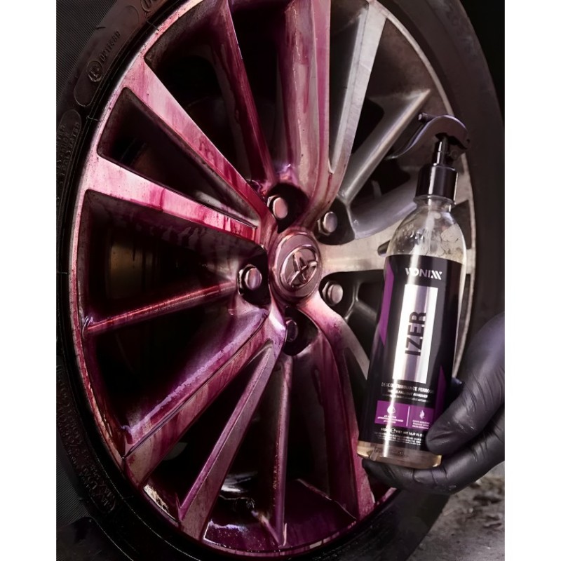 Izer Vonixx 500mL: descontaminante ferroso para rodas. Remove pó de freio, ferrugem superficial e sujeira pesada. Ideal para rodas esportivas e uso profissional.
