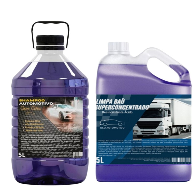 Este combo exclusivo reúne dois produtos profissionais de alta performance: Limpa Baú/Alumínio Concentrado 1/50 e o Shampoo Automotivo com Cera de Carnaúba, que rende até 100 litros após diluição.
