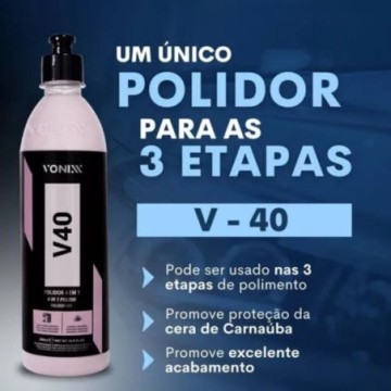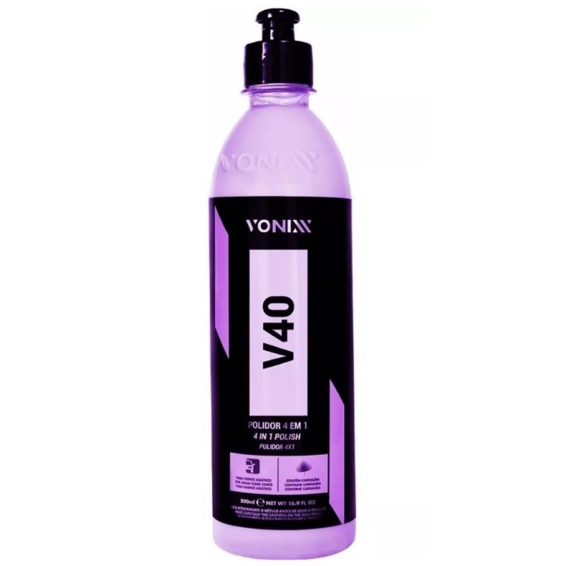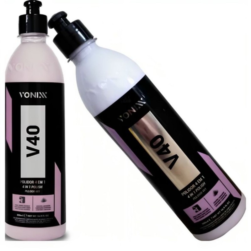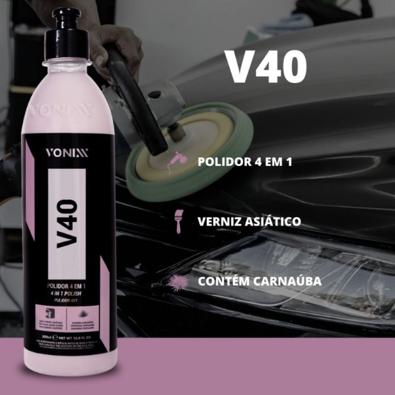 V40 é um polidor 4 em 1, desenvolvido para uso em vernizes asiáticos ou macios. Sua fórmula exclusiva permite uso nas três etapas de polimento, mediante a troca de boinas, promovendo leve proteção da cera de carnaúba.