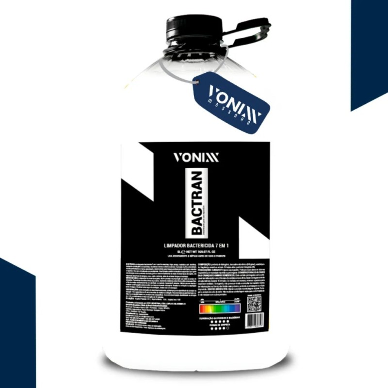 Bactran 5 Litros Vonixx é um poderoso desinfetante e bactericida desenvolvido para proporcionar limpeza e higienização profundas em ambientes e superfícies. Ideal para uso em áreas automotivas, reside