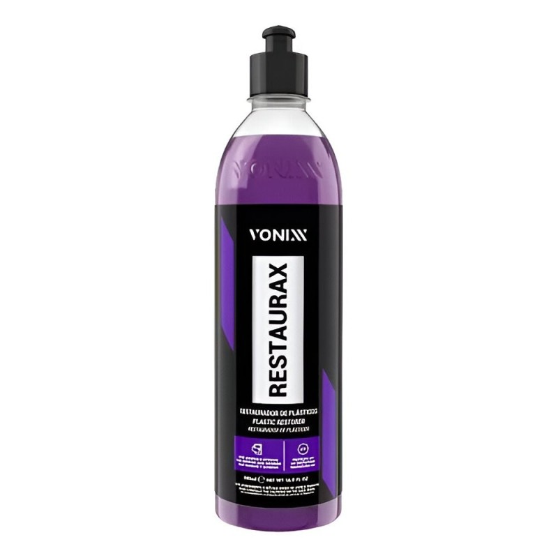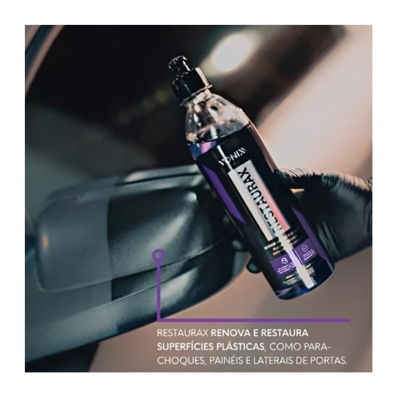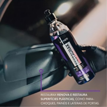 Restaurax renova e restaura superfícies plásticas, como para-choques, painéis e laterais de portas. Sua fórmula contém polímeros especiais que também