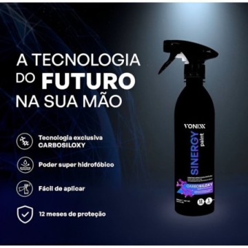 Sinergy é coating spray de fácil aplicação desenvolvido para pintura de automóveis e tem como função proteger a pintura por até 12 meses. O diferencial desse produto é a sua tecnologia exclusiva Vonixx, CARBOSILOXY, onde o elemento químico carbono age em sinergia com o silício e com isso, forma um filme resistente e super hidrofóbico e tem um tempo de cura menor, em média 60 minutos. Além disso, esse produto reduz o atrito, minimizando riscos e promovendo um excelente brilho.