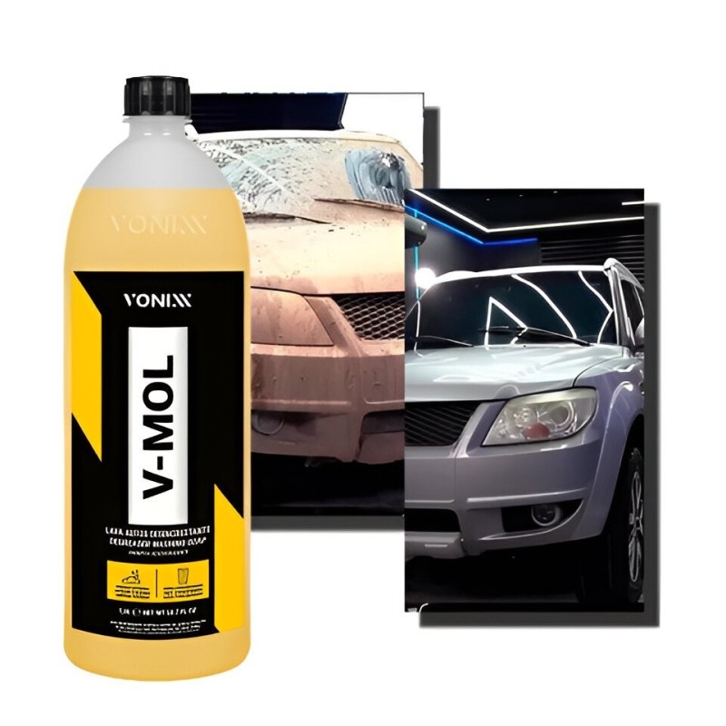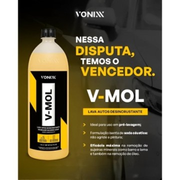 V-Mol Shampoo Automotivo Concentrado Vonixx 1,5L V-Mol é um lava autos biodegradável com pH levemente básico que não agride a superfície. Ideal para lavagem de automóveis, em especial para remoção de sujeiras mais difíceis, como remoção de barro e óleo. DILUIÇÃO: - Sujeira leve/manutenção: 1:100 - Sujeira Média: 1:50 - Sujeira pesada 1:10 BENEFÍCIOS: - Concentrado - Alta Performance MODO DE USO: 1 - Diluir o produto na proporção indicada; 2 - Iniciar a lavagem com o auxílio de uma luva de microfibra, sempre começando pelas partes superiores do veículo; 3 - Mergulhar a luva na solução e esfregar suavemente até completar o veículo; 4 - Enxaguar em seguida até a retirada de todo o produto; 5 - Secar o veículo por completo a fim de evitar manchas