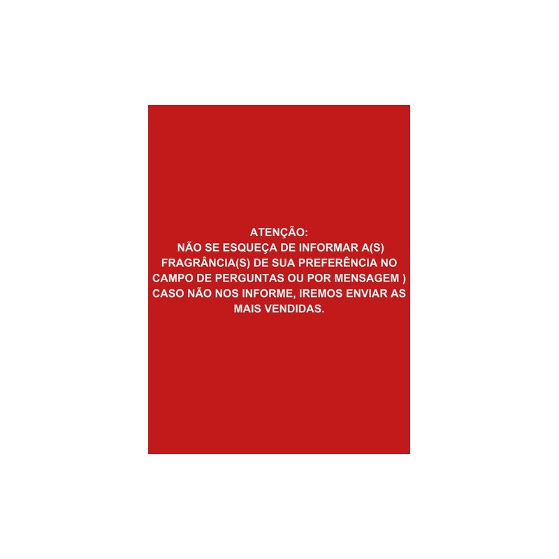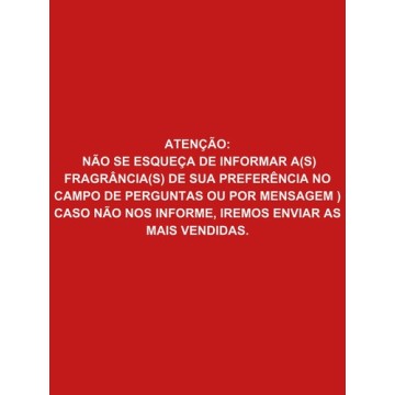 Disponiveis nas fragrâncias ALFAZEMA, ALGAS MARINHAS, SEMELHANÇA OLFATIVA À BIOGRAFIA, SEMELHANÇA OLFATIVA À BOTICÁRIO, CAMPESTRE, CASA LIMPA, CITRONELA, DAMA DA NOITE, SEMELHANÇA OLFATIVA À DAVEN E, SEMELHANÇA OLFATIVA À DOV E, ERVA DOCE, EUCALIPTO, FLOR DE CAMPO, FLORAL, FANTASIA, SEMELHANÇA OLFATIVA À GIOVANA BABY, HERBAL, JASMIM, SEMELHANÇA OLFATIVA À KAIAK, LAVANDA, LAVANDA GLEIDY, LAVANDA MON BLANC,MAÇÃ, MAÇÃ VERDE, SEMELHANÇA OLFATIVA À MAMÃE BEBÊ, MORANGO, SEMELHANÇA OLFATIVA À PALMOLIV E, SEMELHANÇA OLFATIVA À PINHO SOL, PITANGA, TALCO, TUTTI FRUTTI, 24 HORAS, entre outras..
