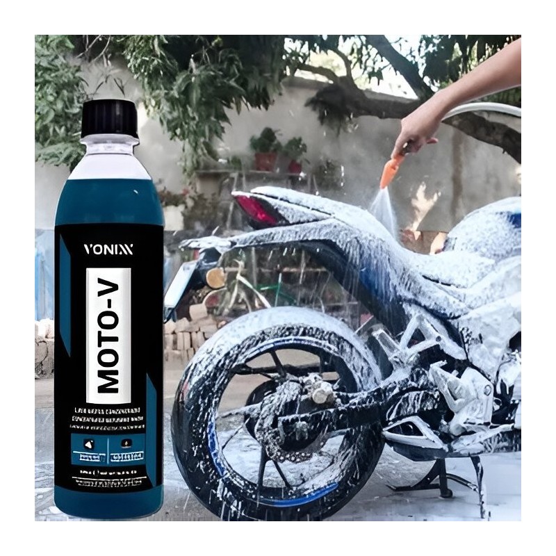 O MOTO-V é um lava-motos de alta eficiência, ideal para a limpeza completa da sua motocicleta. Sua formulação balanceada permite o uso em todas as partes da moto, incluindo motor, pintura, metais e plásticos, sem causar danos.