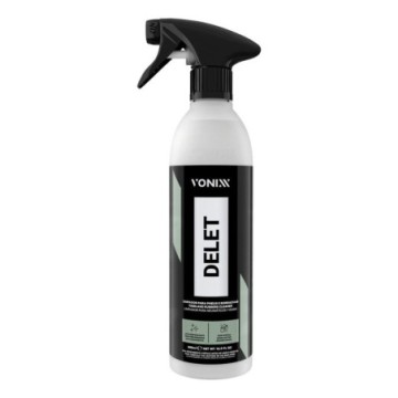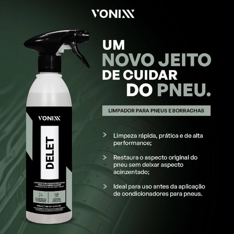 Delet Vonixx Limpa Pneus e Borrachas (500ml) limpador de borrachas e pneus, que limpa e restaura o acabamento original dos mesmos, deixando-os prontos para receber a proteção. Delet Vonixx é um limpador de alta performance, formulado exclusivamente para remover sujidade severa em pneus e borrachas, garantindo total limpeza,devolvendo originalidade e sem deixar aspecto acinzentado. Essa limpeza ajudará a melhorar a performance dos produtos para condicionar os pneus. Vonixx Delet limpa de forma profunda borrachas e pneus, removendo os resíduos de outros condicionadores e várias outras contaminações que atingem a borracha. Características Limpa Pneus; Limpa Borrachas; Alta Performance; Restaura o acabamento; Limpeza profunda; Pronto para uso; Embalagem de 500ml. Modo de uso Passe água nos pneus; Pulverize o Delet em boa quantidade na borracha, deixe agir por alguns segundos; Faça a limpeza usando uma escova ou pincel; Enxágue em seguida usando água; Repita até que a limpeza esteja completa; Depois de totalmente secos, proteja os pneus com um condicionador de qualidade.