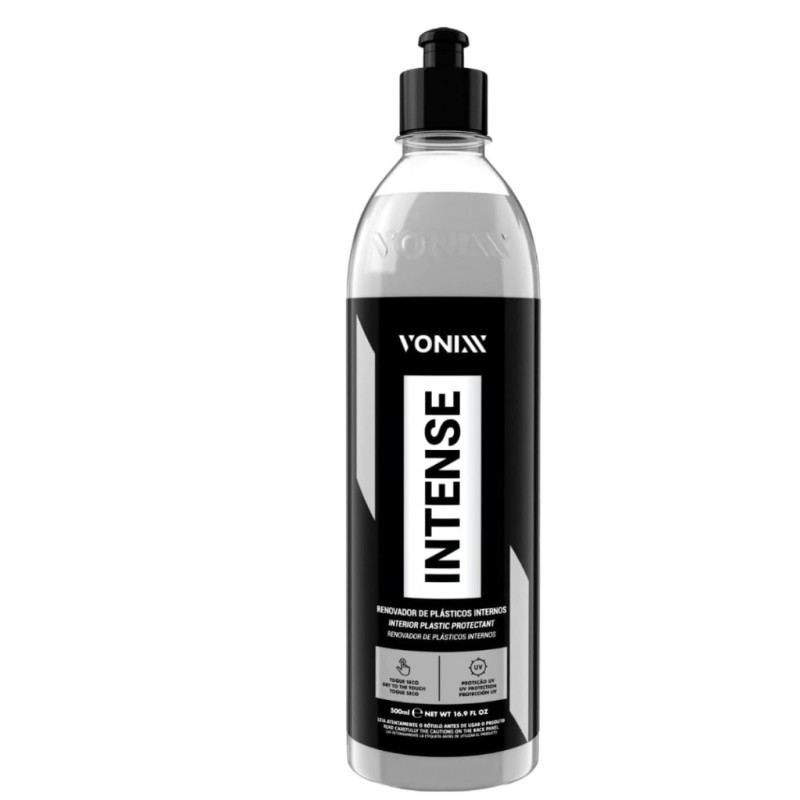 Intense é um renovador de plástico com proteção UV, cuja fórmula balanceada promove acabamento natural e toque seco, com durabilidade de 6 meses. O produto deve ser utilizado especificamente na parte interna do automóvel, em superfícies como vinil e plástico em geral. Diluição Pronto uso Duranbilidade Até seis meses de proteção nos plásticos internos Informações adicionais Intense pode ser utilizado em painéis soft touch. Não recomendamos o uso do produto em plásticos externos e em couro -Toque seco -Proteção UV Modo de uso 1. Certifique-se que a superfície esteja limpa e seca; 2. Aplique uma pequena quantidade de produto de maneira uniforme com o auxílio de um aplicador de microfibra; 3. Espalhe bem até o total preenchimento da peça. Obs. Se necessário, repita a operação; qualquer mancha ou excesso poderá ser removido com uma toalha de microfibra limpa e seca