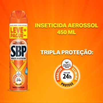 SBP Multi Inseticida Aerossol oferece proteção por até 12 horas (baseado em teste de eficácia residual) e é eficaz contra moscas, pernilongos, mosquitos (incluindo o mosquito da Dengue, Zika e Chikungunya), muriçocas, baratas, aranhas e pulgas.