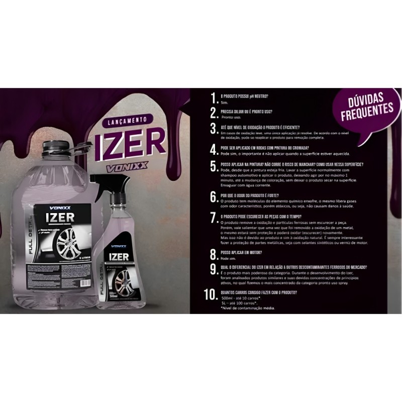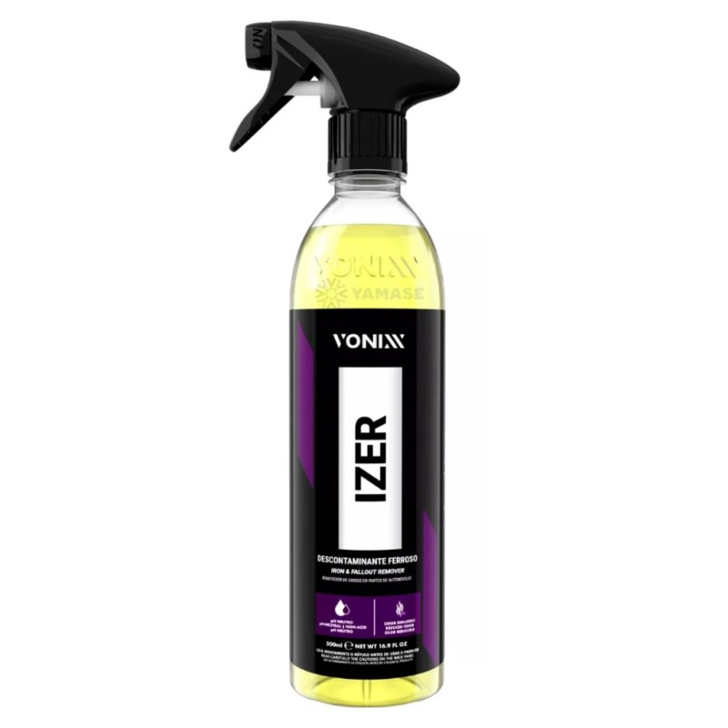 Descrição Vonixx Izer Descontaminante de Ferro (500ml) descontaminante ferroso de alta tecnologia, indicado para a remoção e descontaminação de partículas ferrosas das superfícies. Izer é um desconta