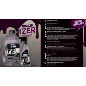 Descrição Vonixx Izer Descontaminante de Ferro (500ml) descontaminante ferroso de alta tecnologia, indicado para a remoção e descontaminação de partículas ferrosas das superfícies. Izer é um descontaminante ferroso utilizado para remoção de fuligem de freio oxidado em rodas. Por ter pH neutro, o produto poderá ser utilizado para remoção de oxidação de material ferroso na pintura, e demais partes externas do veículo. No motor, ajuda a eliminar a oxidação de partes metálicas deixando-o com aspecto renovado. Em partes cromadas que tenham pontos de ferrugem o produto ajuda a remover. A contaminação de ferro pode estar em cima do verniz e muitas vezes também se encontra dentro do verniz. Essa contaminação que se encontra dentro do verniz, só é possível ser removida com um descontaminante de partículas ferrosas como o Izer, já que a Clay Bar vai remover a contaminação sobre a superfície e não dentro dela. Produto pronto pro uso. Não diluir. Modo de uso: Certifique-se que a superfície esteja fria e na sombra; Faça uma limpeza prévia da superfície com produto do seu gosto; Borrife o Izer na superfície; Aguarde de 2 a 3 minutos e observe a formação de uma cor roxa ou mais escura; Utilize um pincel ou escova de detalhamento para esfregar gentilmente o produto; Caso existam partículas de ferro oxidado, o produto terá alteração de sua cor naturalmente incolor para cor roxa ou vermelha; Remova totalmente o produto com jato de água em abundância. * Caso não haja mudança na coloração do produto, a superfície está livre de contaminação por partículas de ferro oxidado; * Não aplicar ao Sol. Pode ser usado também em cima da pintura ou nos vidros do veículo. Dica: Interessante é usar o Izer antes de iniciar uma descontaminação da pintura. Deste modo você ameniza a contaminação, removendo já boa parte, fazendo com que a descontaminação com clay bar tenha menos atrito, diminuindo o risco de causar marcas na pintura.