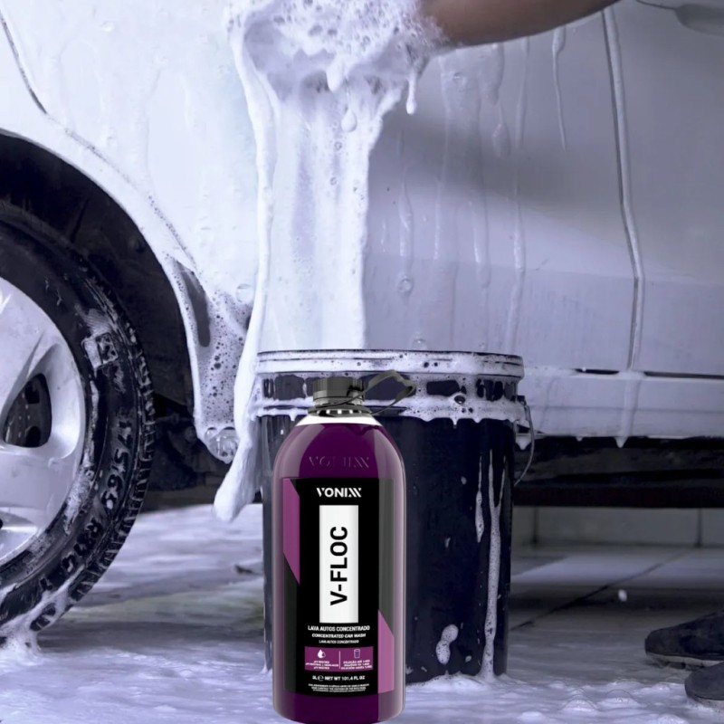 V-Floc é um lava autos de alta performance e de pH neutro. Sua fórmula contém agentes condicionadores e tensoativos especiais que proporcionam uma lavagem suave e eficiente. V-Floc tem alto grau de lubrificação, promovendo redução significativa do coeficiente de atrito, proporcionando um melhor deslize da luva microfibra e reduzindo de forma efetiva as chances de microrriscos na pintura. V-Floc também promove brilho e aspecto de renovação da pintura.